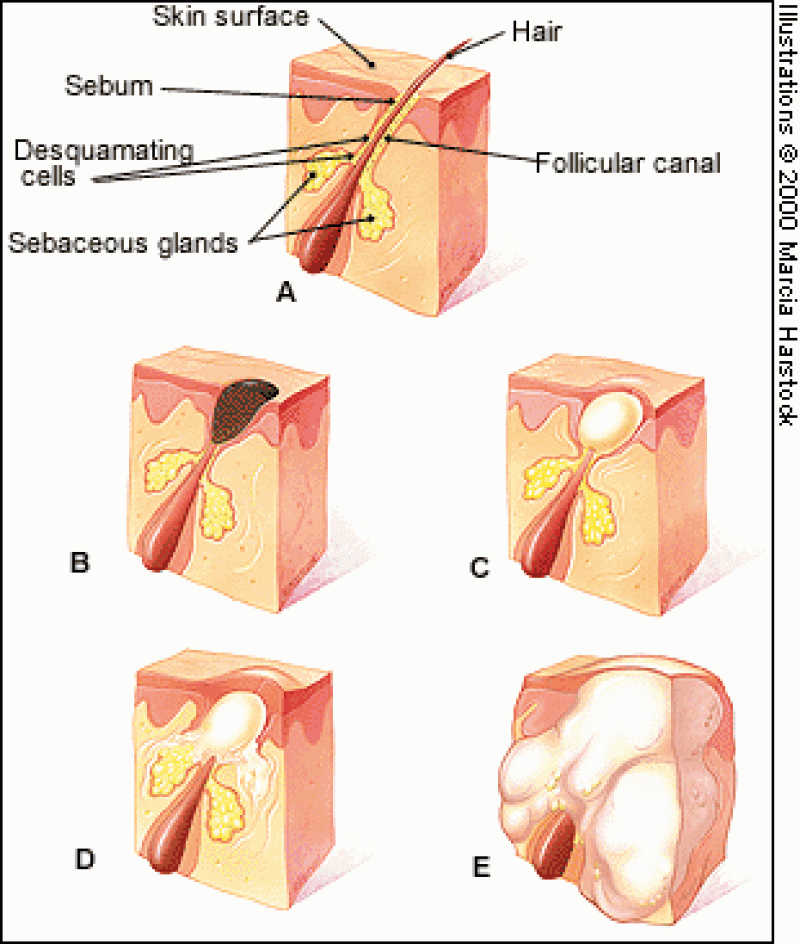 تطور حب الشباب كما هو موضح (أعلاه) الشكل (أ) يوضح جُرَيْبا شَعْرِيًا عاديّاَ وغُدَّة زهمية، وفي الشكل (ب) سدادة تمنع انسياب الزيت من الجُرَيْب الشَّعْري، فتتكاثر البكتيريا داخل الزَّيْت المغلق، وفي الشكلين (ج) و (د) ينتفخ الجُرَيْب بالصَّديد، فتنفجر جدران الجُرَيْب في النهاية ويخرج الصديد كما هو موضح في الشكل(هـ).